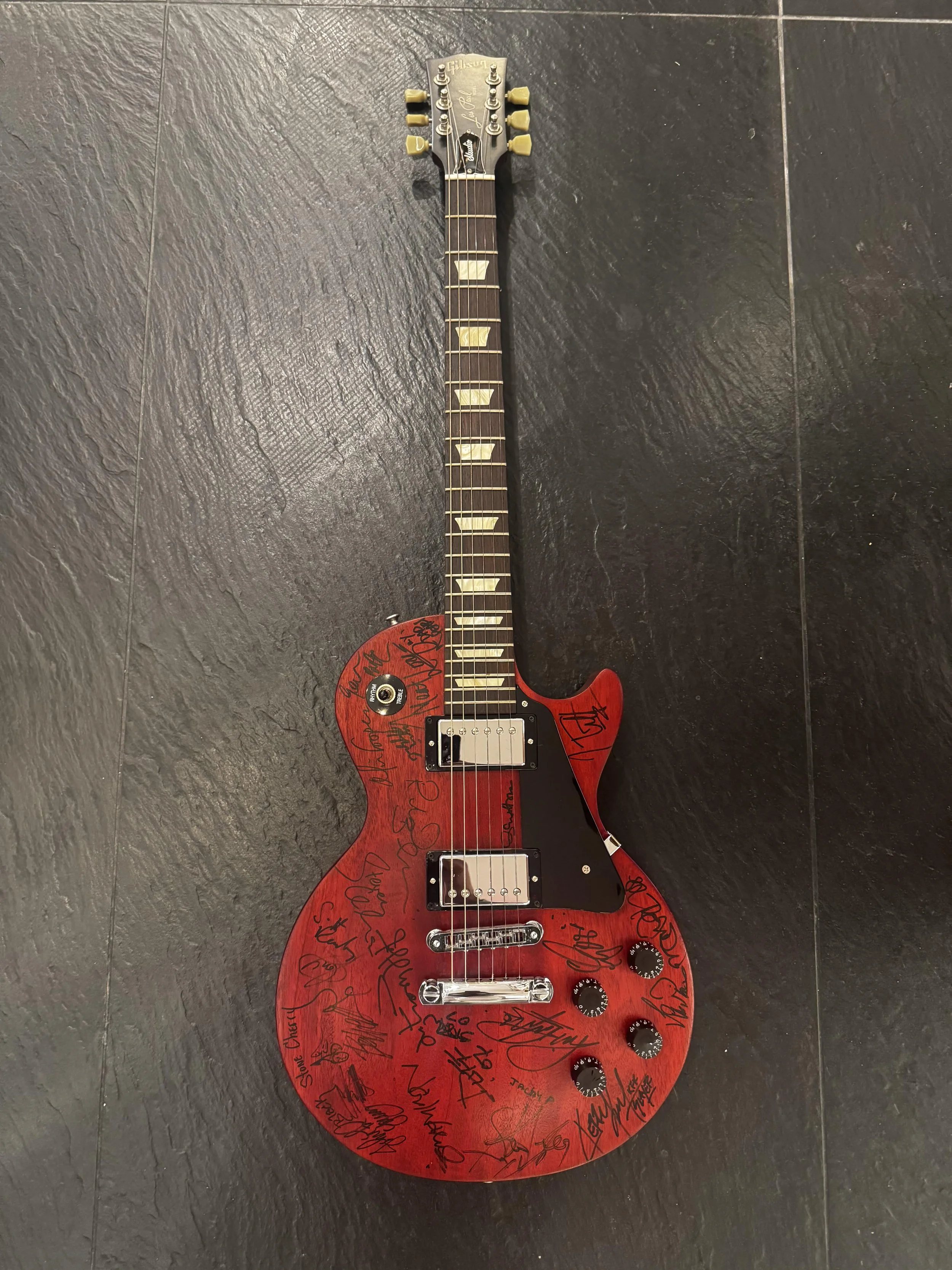 Signed in such a way that the guitar can be prominently displayed vertically.