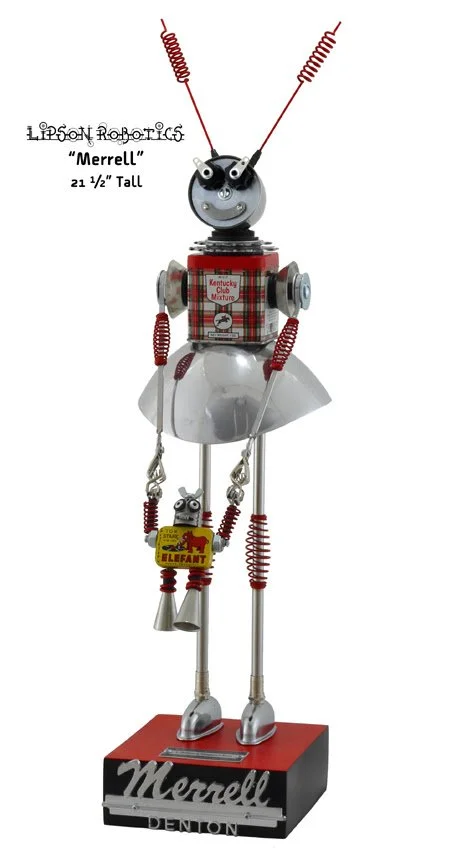 David Lipson assembles one-of-a-kind robot sculptures from found objects, old and new. Utilizing only nuts and bolts, fabrication is uniquely accomplished without welding.